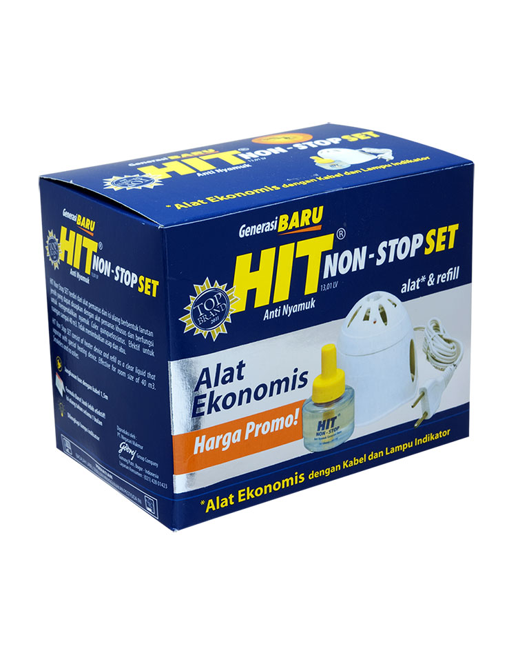 HIT Non Stop Set is the NEW GENERATION of mosquitoes repellent, contains the electric device and clear liquid refill to exterminate and control mosquitoes. There are 2 options: 1. HIT Non Stop EKO Set and 2. HIT Non Stop Set Extra Power with EXTRA POWER Button.